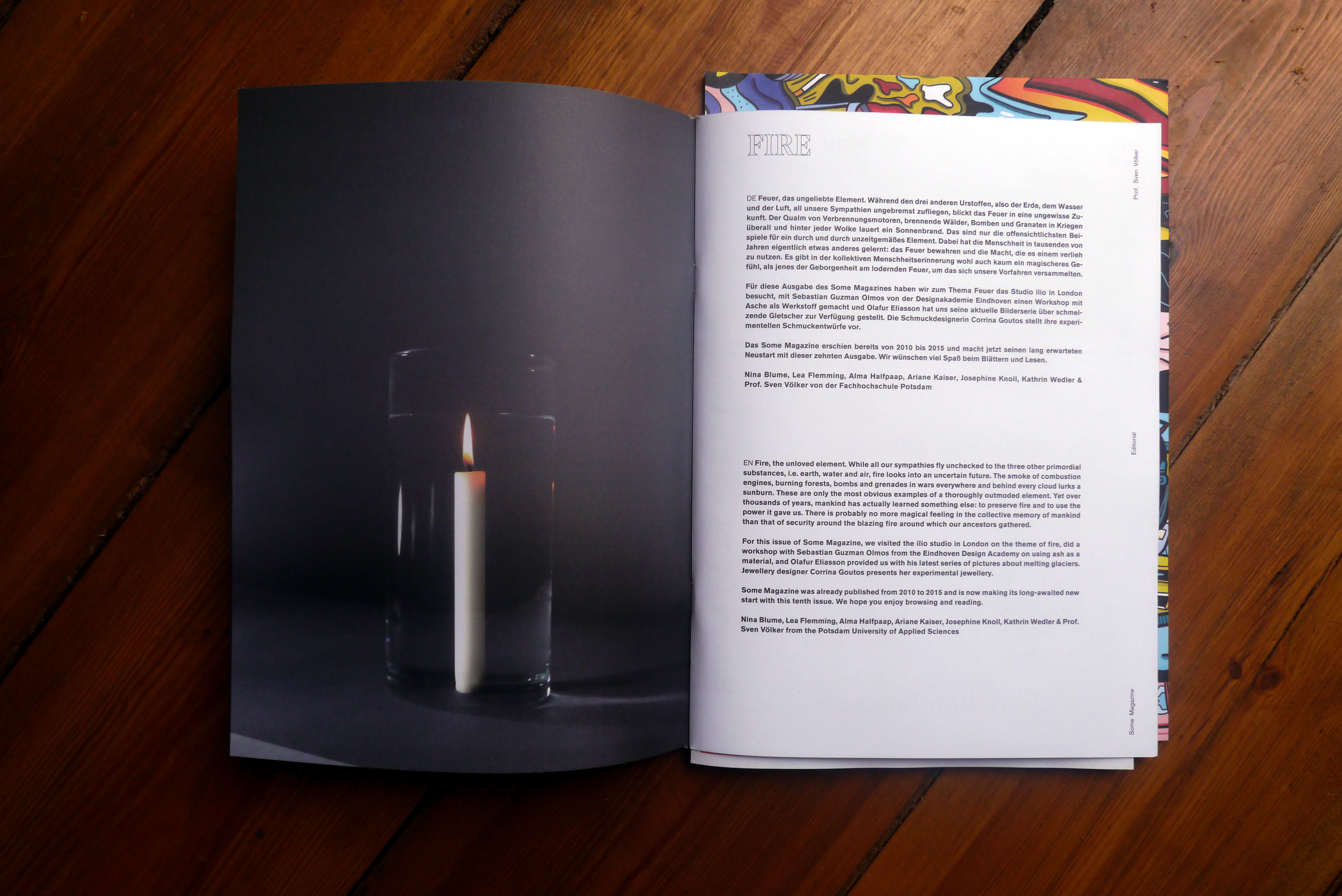 For this issue of Some Magazine, we visited the ilio studio in London on the theme of fire, did a workshop with Sebastian Guzman Olmos from the Eindhoven Design Academy on using ash as a material, and Olafur Eliasson provided us with his latest series of pictures about melting glaciers. Jewellery designer Corrina Goutos presents her experimental jewellery.